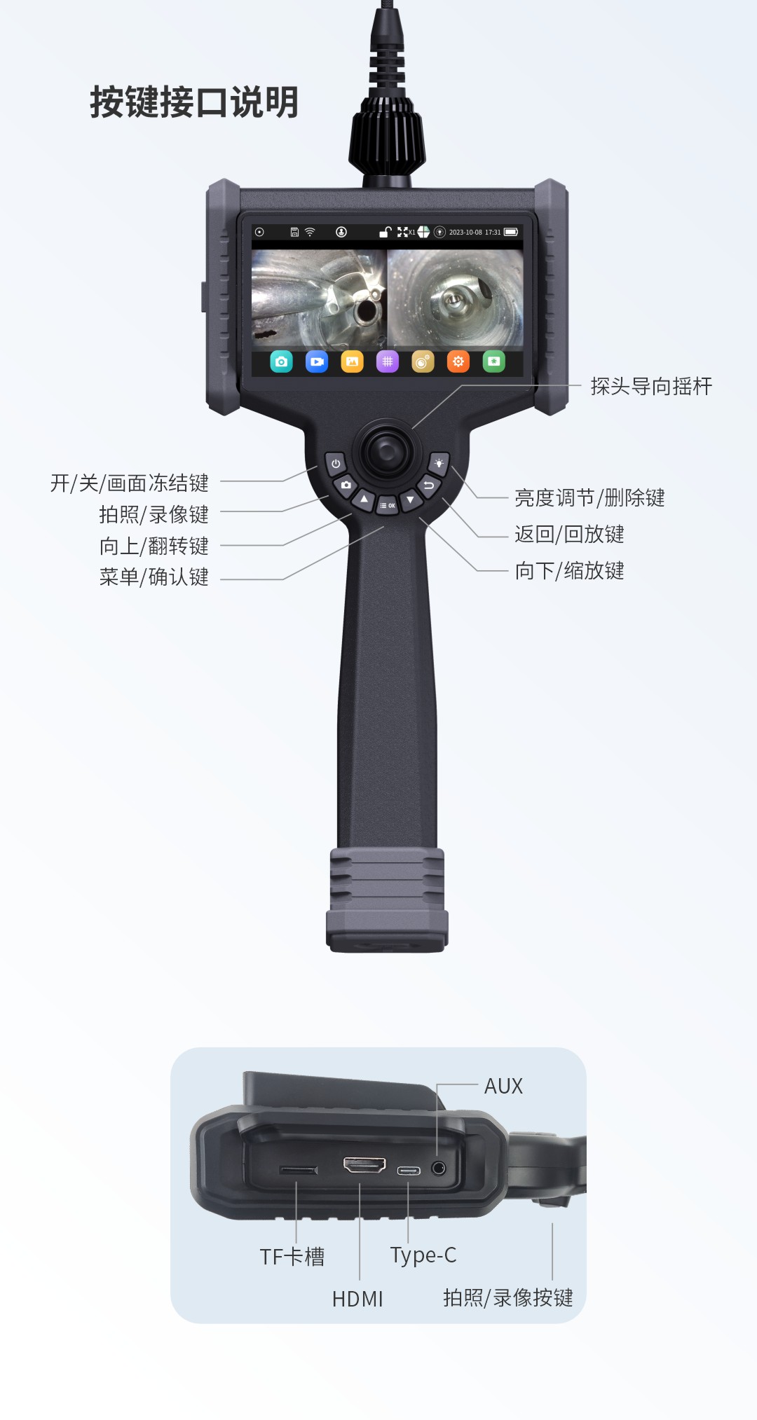 優(yōu)勢特點:6英寸高清觸摸屏、快速更換管線、360°全方向擺頭、后置LED光纖導(dǎo)光、18650電池,工作時長≥8